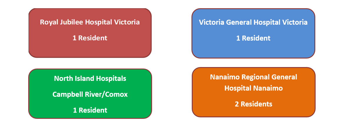 Residents will be assigned to one of four PODS based at either the Royal Jubilee Hospital (Victoria), the Victoria General Hospital (Victoria) and the Nanaimo Regional General Hospital (Nanaimo) or North Island Hospitals (Campbell River/Comox). Incoming residents will rank their preference for POD assignments. The residency coordinator will then determine POD assignments based on survey results.